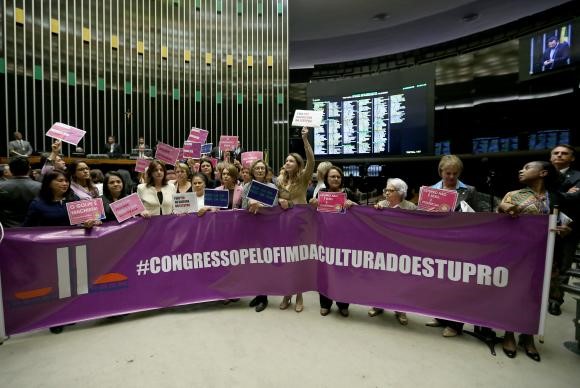 Um grupo de mulheres fez um protesto nesta terça-feira (31) no Congresso Nacional contra a cultura do estupro.