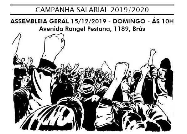 O Sindicato convoca todas as trabalhadoras e trabalhadores para assembleia geral decisiva da campanha salarial 2019/2020.O Sindicato convoca todas as trabalhadoras e trabalhadores para assembleia geral decisiva da campanha salarial 2019/2020.A assembleia será realizada no dia 15 de dezembro de 2019, na sede central do sindicato, às 10h, para discutirmos o reajuste salarial para o ano de 2020.