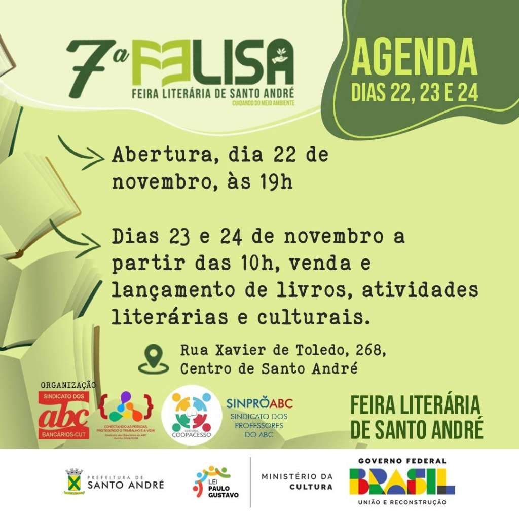 A Feira Literária de Santo André (Felisa) chega à sua sétima edição em 2024, trazendo uma programação extensa e plural. O evento ocorre nos dias 22, 23 e 24 de novembro, com entrada gratuita, na sede social do Sindicato dos Bancários do ABC, localizada na Rua Xavier de Toledo, 268, no centro da cidade.