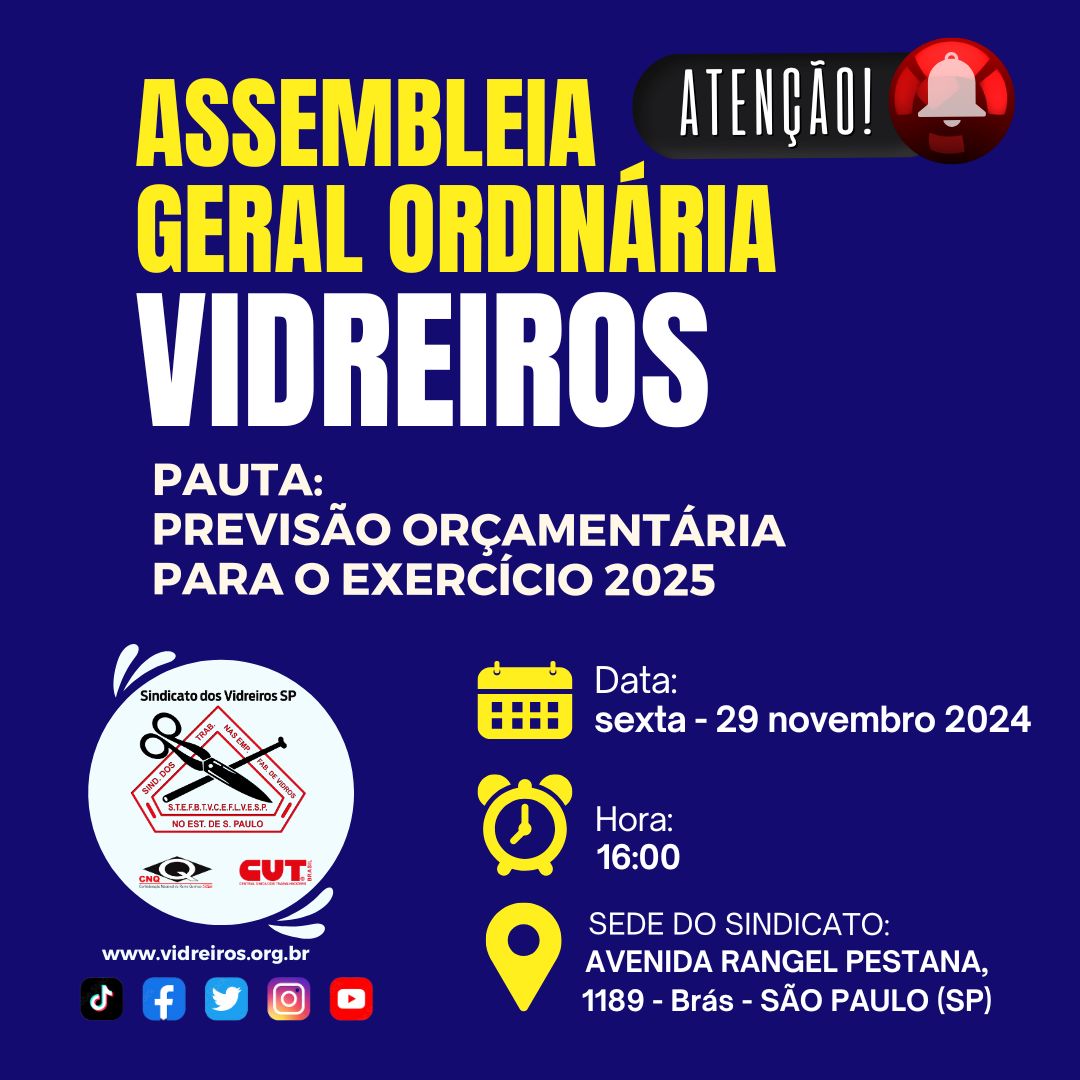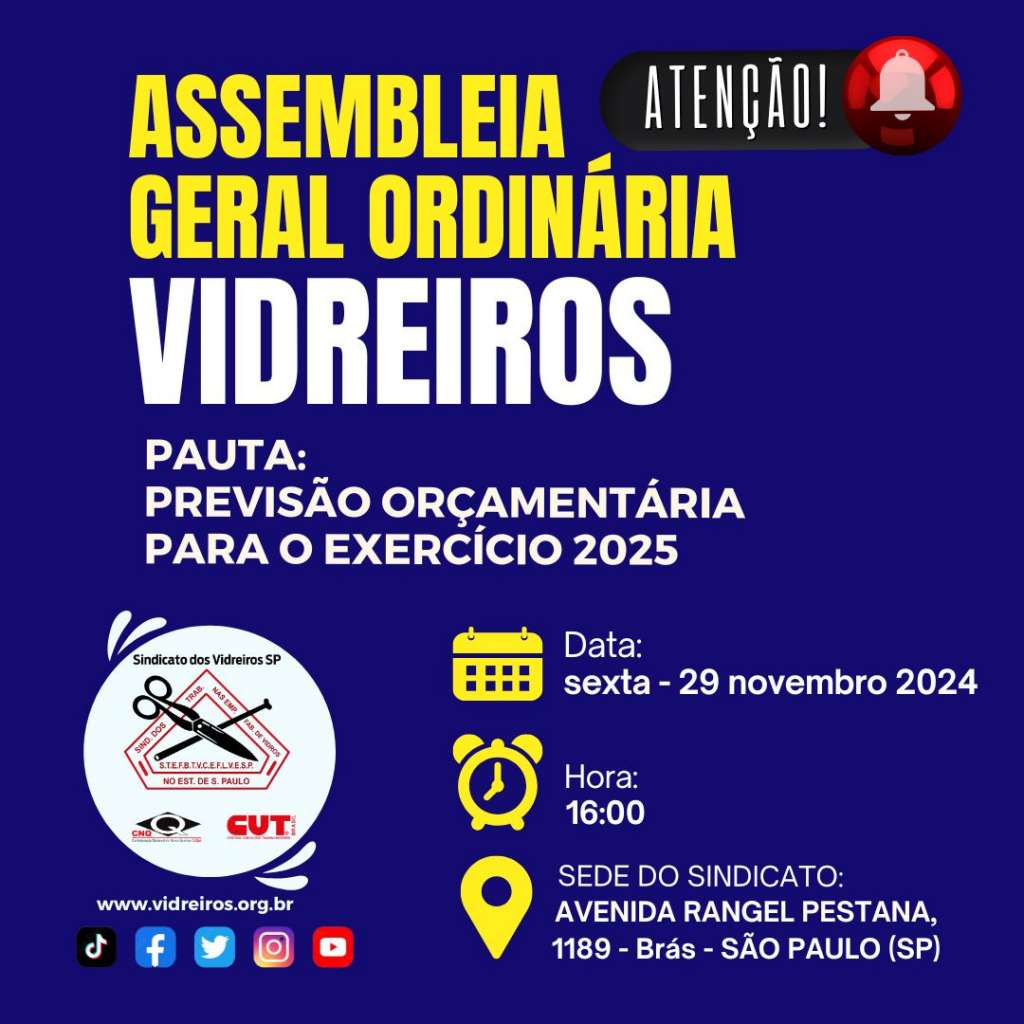 A diretoria do Sindicato dos Vidreiros no Estado de São Paulo convoca os companheiros e companheiras associados da categoria vidreira para discutir a Previsão Orçamentária referente ao ano exercício de 2025.
